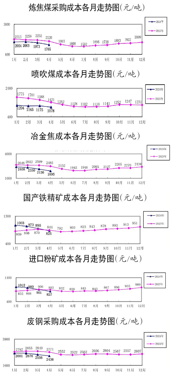 1月—4月份,煉焦煤采購成本同比下降11.82%;冶金焦同比下降15.97%;國產鐵精礦同比上升8.80%,進口粉礦同比上升5.56%;廢鋼同比下降7.88%。