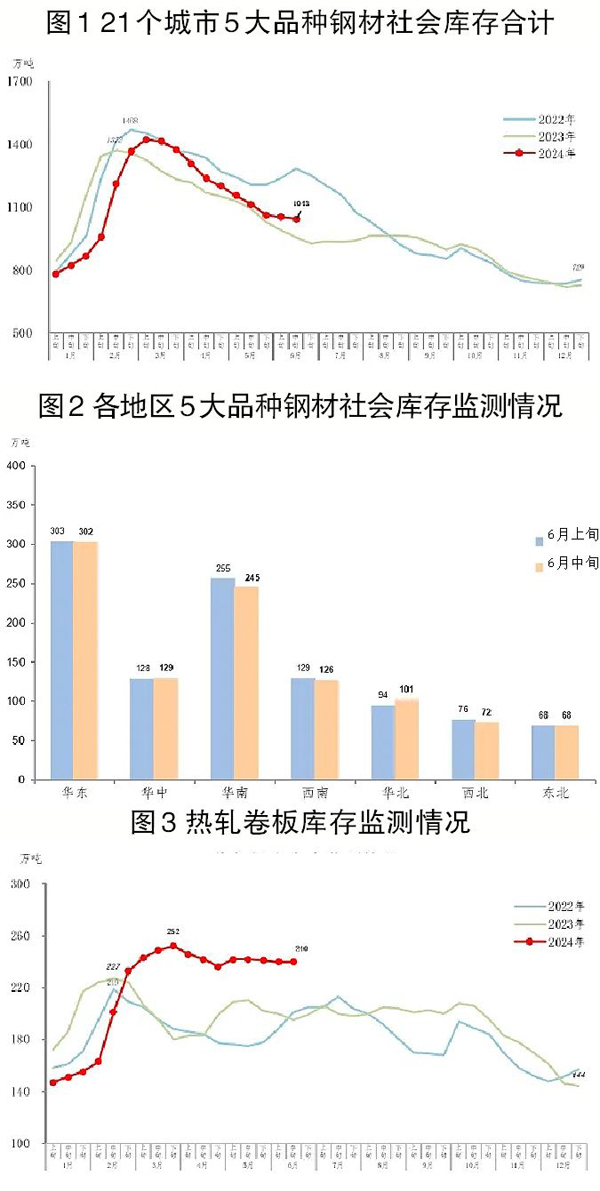 6月中旬,5大品種鋼材社會庫存環比波動不大。其中,中厚板、線材、螺紋鋼環比均有所下降,熱軋卷板、冷軋卷板環比均持平。熱軋卷板庫存為240萬噸,環比持平,庫存維持高位;比今年初增加96萬噸,上升66.7%;比上年同期增加45萬噸,上升23.1%。冷軋卷板庫存為135萬噸,環比持平,庫存小幅波動;比今年初增加32萬噸,上升31.1%;比上年同期增加19萬噸,上升16.4%。中厚板庫存為115萬噸,環比減少6萬噸,下降5.0%,庫存由升轉降;比今年初增加21萬噸,上升22.3%;比上年同期增加23萬噸,上升25.0%。線材庫存為94萬噸,環比減少1萬噸,下降1.1%,庫存繼續下降,降幅收窄;比今年初增加11萬噸,上升13.3%;比上年同期減少15萬噸,下降13.8%。螺紋鋼庫存為459萬噸,環比減少3萬噸,下降0.6%,庫存略有下降;比今年初增加154萬噸,上升50.5%;比上年同期增加15萬噸,上升3.4%。