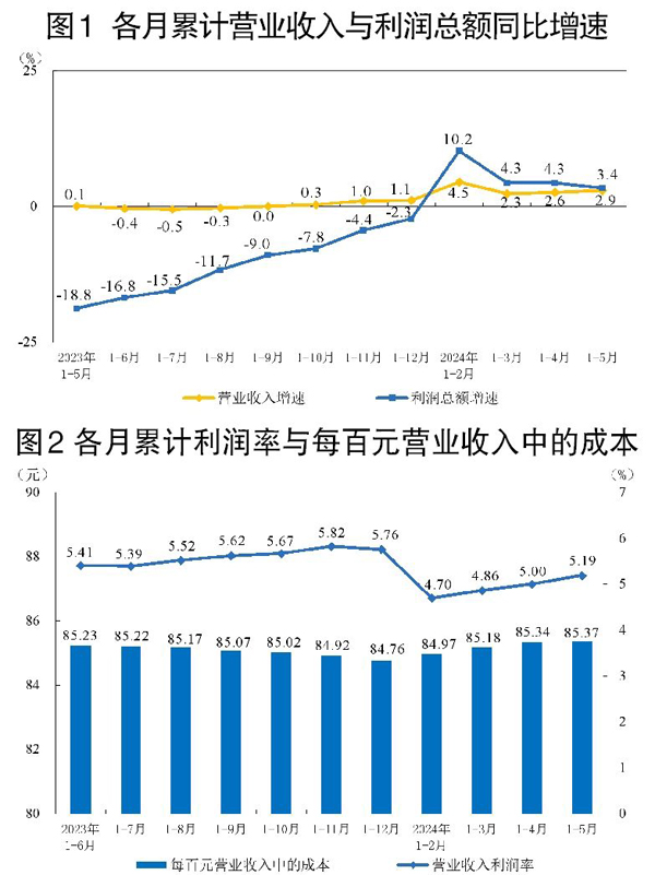 1月—5月份,采礦業實現利潤總額5024.5億元,同比下降16.2%;制造業實現利潤總額19285.7億元,增長6.3%;電力、熱力、燃氣及水生產和供應業實現利潤總額3233.6億元,增長29.5%。