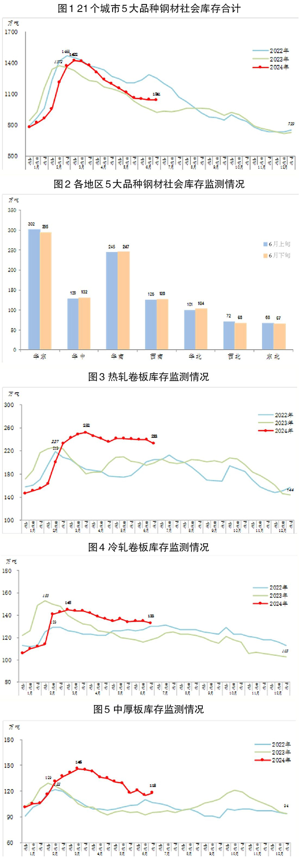 6月下旬,5大品種鋼材社會庫存環比各有升降,其中熱軋卷板和冷軋卷板庫存有所下降,其他品種略有上升。熱軋卷板庫存為233萬噸,環比減少7萬噸,下降2.9%,庫存降幅擴大;比5月下旬減少8萬噸,下降3.3%;比今年初增加89萬噸,上升61.8%;比上年同期增加34萬噸,上升17.1%。冷軋卷板庫存為133萬噸,環比減少2萬噸,下降1.5%,庫存小幅下降;比5月下旬減少1萬噸,下降0.7%;比今年初增加30萬噸,上升29.1%;比上年同期增加15萬噸,上升12.7%。中厚板庫存為118萬噸,環比增加3萬噸,上升2.6%,庫存轉降為升;與5月下旬庫存持平;比今年初增加24萬噸,上升25.5%;比上年同期增加23萬噸,上升24.2%。線材庫存為96萬噸,環比增加2萬噸,上升2.1%,庫存連續10旬下降后首次回升;比5月下旬減少1萬噸,下降1.0%;比今年初增加13萬噸,上升15.7%;比上年同期減少1萬噸,下降1.0%。螺紋鋼庫存為461萬噸,環比增加2萬噸,上升0.4%,庫存連續10旬下降后小幅上升;比5月下旬減少10萬噸,下降2.1%;比今年初增加156萬噸,上升51.1%;比上年同期增加46萬噸,上升11.1%。
