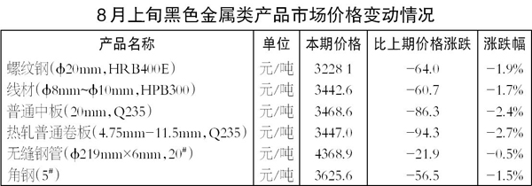 8月上旬,Φ20毫米HRB400E螺紋鋼價格為3228.1元/噸,環比下降64.0元/噸,降幅為1.9%;Φ8毫米~Φ10毫米HPB300線材價格為3442.6元/噸,環比下降60.7元/噸,降幅為1.7%;20毫米Q235普通中板價格為3468.6元/噸,環比下降86.3元/噸,降幅為2.4%;4.75毫米~11.5毫米Q235熱軋普通卷板價格為3447.0元/噸,環比下降94.3元/噸,降幅為2.7%;Φ219毫米×6毫米20#無縫鋼管價格為4368.9元/噸,環比下降21.9元/噸,降幅為0.5%;5#角鋼價格為3625.6元/噸,環比下降56.5元/噸,降幅為1.5%。 (郭同炬)