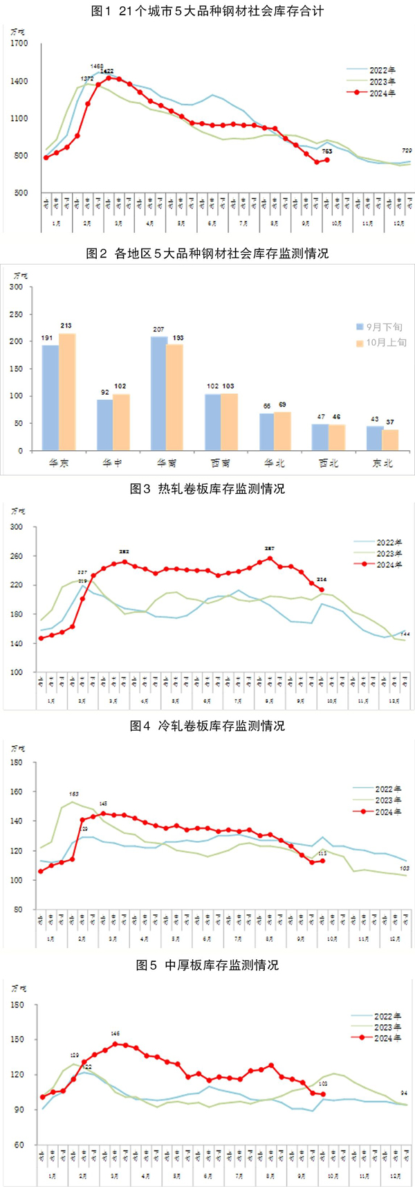10月上旬,5大品種鋼材社會庫存環比各有升降,其中長材上升幅度較大,板材總體環比下降。熱軋卷板庫存為214萬噸,環比減少9萬噸,下降4.0%,庫存降幅收窄;比今年初增加70萬噸,上升48.6%;比上年同期增加6萬噸,上升2.9%。冷軋卷板庫存為113萬噸,環比增加1萬噸,上升0.9%,庫存由下降轉為小幅上升;比今年初增加10萬噸,上升9.7%;比上年同期減少8萬噸,下降6.6%。中厚板庫存為103萬噸,環比減少1萬噸,下降1.0%,庫存降幅收窄;比今年初增加9萬噸,上升9.6%;比上年同期減少15萬噸,下降12.7%。線材庫存為72萬噸,環比增加7萬噸,上升10.8%庫存回升幅度較大;比今年初減少11萬噸,下降13.3%;比上年同期減少17萬噸,下降19.1%。螺紋鋼庫存為261萬噸,環比增加17萬噸,上升7.0%,庫存連續8旬下降后首次上升;比今年初減少44萬噸,下降14.4%;比上年同期減少127萬噸,下降32.7%。