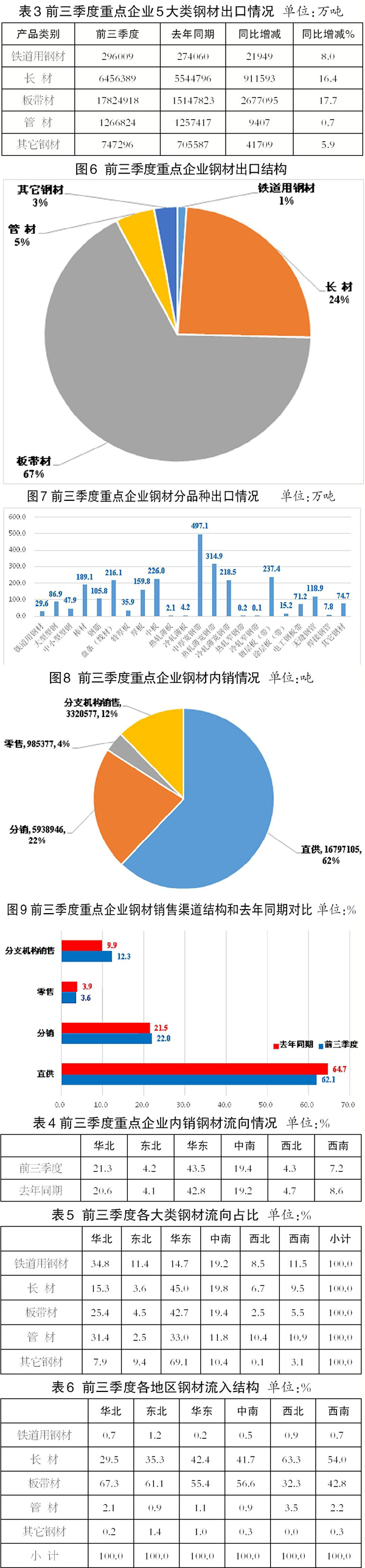 從品種大類來看,前三季度重點企業5大類品種鋼材中,長材、管材2個大類品種的銷售量出現了同比下降,分別同比下降10.8%、3.3%;鐵道用鋼材、板帶材和其它鋼材等3個大類品種的銷售量則出現了同比增長,分別同比增長4.2%、0.4%和7.1%。