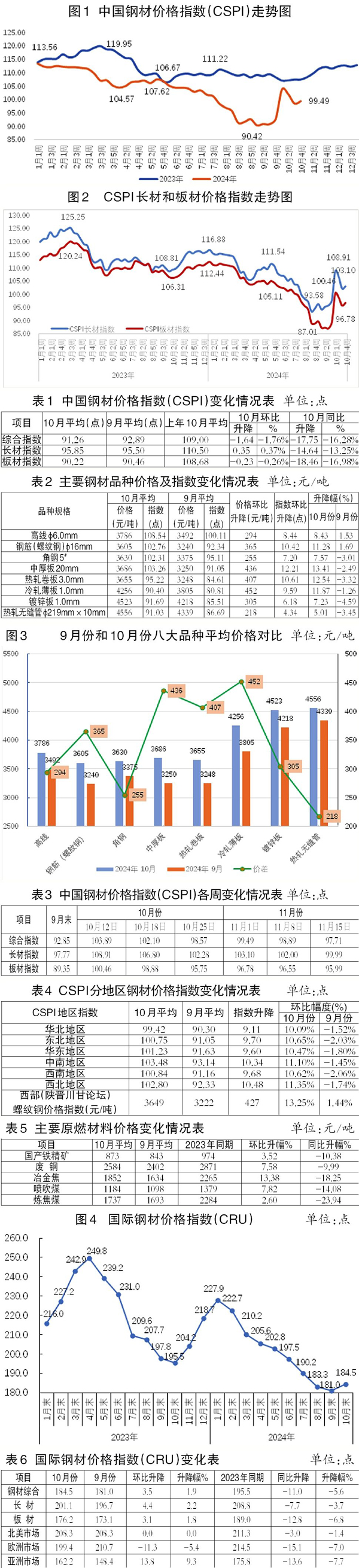 1月—10月份,CSPI長材指數平均值為106.23點,同比下降9.26點,降幅為8.02%;板材指數平均值為101.50點,同比下降10.76點,降幅為9.58%。