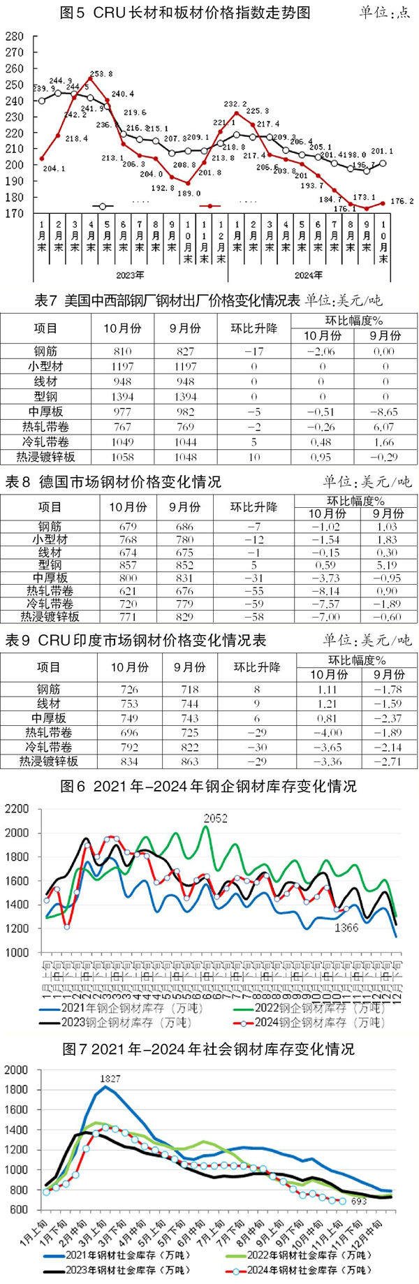 1月—10月份,CRU長材指數平均值為207.16點,同比下降20.35點、降幅為8.94%;CRU板材指數平均值為197.27點,同比下降19.14點、降幅為8.84%。
