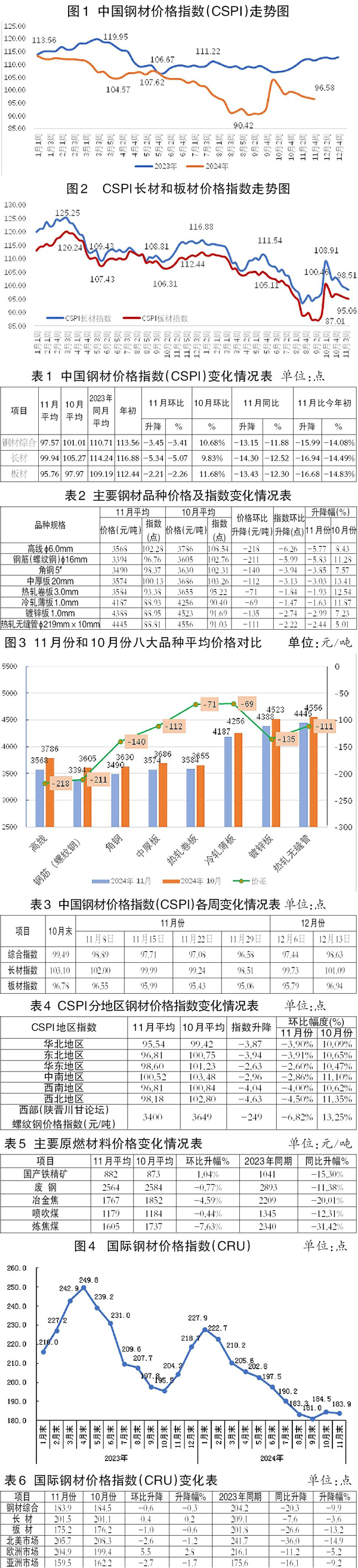 據(jù)中國鋼鐵工業(yè)協(xié)會監(jiān)測,11月份,中國鋼材價格指數(shù)(CSPI)平均值為97.57點,環(huán)比下降3.45點、降幅為3.41%,同比下降13.15點、降幅為11.88%。其中,CSPI長材指數(shù)平均值為99.94點,環(huán)比下降5.34點、降幅為5.07%,同比下降14.30點、降幅為12.52%;板材指數(shù)平均值為95.76點,環(huán)比下降2.21點、降幅為2.26%,同比下降13.43點、降幅為12.30%。