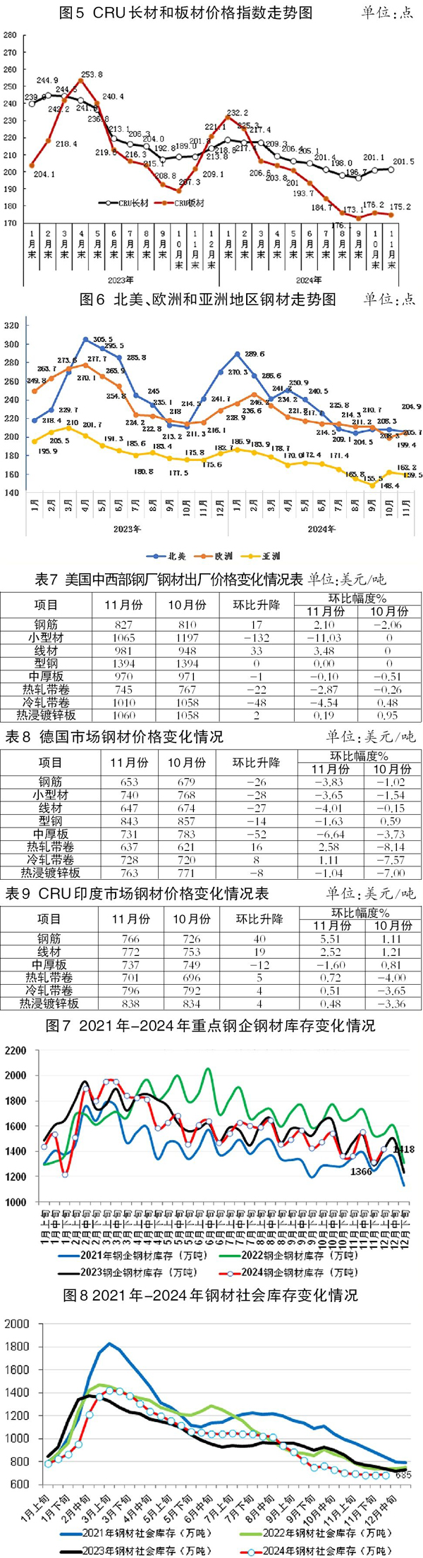 1月—11月份,CRU長材指數(shù)平均值為206.6點,同比下降19.2 點、降幅為8.5%;CRU板材指數(shù)平均值為195.3點,同比下降19.9點、降幅為9.2%。