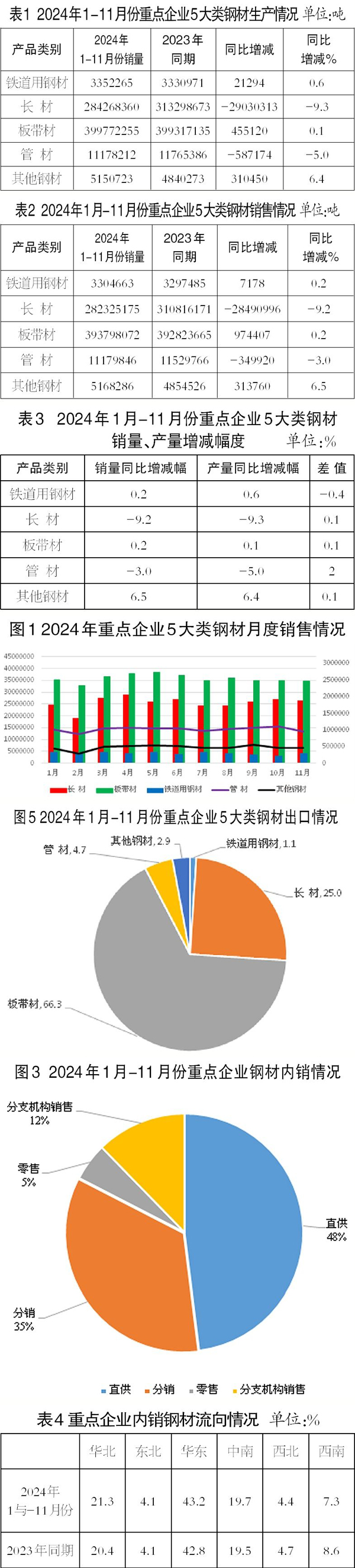 和2023年同期相比,1月—11月份重點企業通過直供、分支機構銷售在內銷中的占比分別提升0.3個、0.2個百分點,通過分銷、零售渠道銷售在內銷中的占比分別下降0.04個、0.4個百分點。這顯示市場需求走弱、行業困境未破格局下,鋼鐵企業為降低風險、減少隱患,嚴格執行以銷定產、按訂單生產的原則,更多地依靠自身銷售系統來推進鋼材銷售。