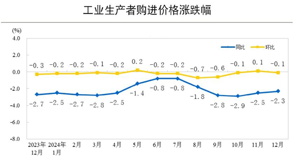 本報訊 2024年12月份,全國工業生產者購進價格同比下降2.3%,降幅比2024年11月份收窄0.2個百分點;環比下降0.1%。其中,黑色金屬材料類購進價格同比下降7.9%,環比下降0.2%。