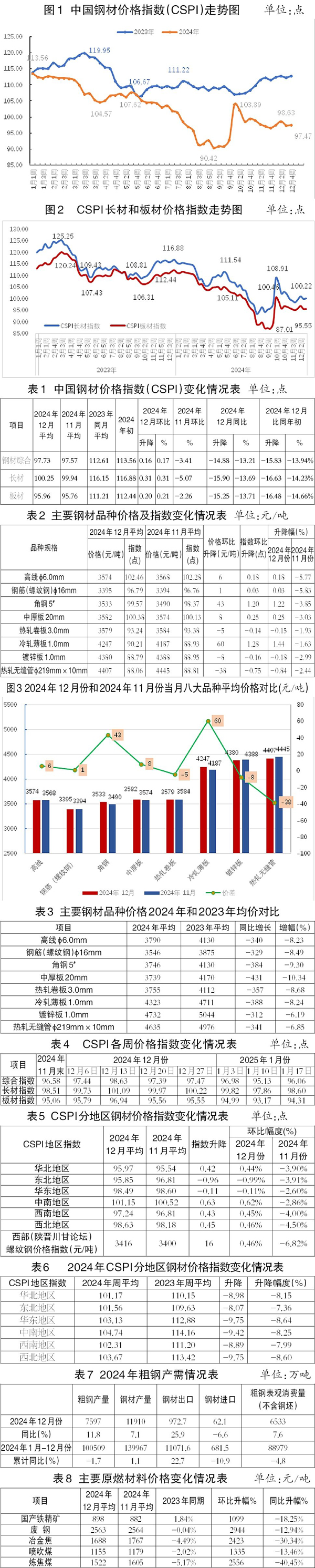 據(jù)中國鋼鐵工業(yè)協(xié)會監(jiān)測,2024年12月份,中國鋼材價格指數(shù)(CSPI)平均值為97.73點,環(huán)比上升0.16點、升幅為0.17%,同比下降14.88點、降幅為13.21%。其中,CSPI長材指數(shù)平均值為100.25點,環(huán)比上升0.31點、升幅為0.31%,同比下降15.90點、降幅為13.69%;板材指數(shù)平均值為95.96點,環(huán)比上升0.20 點、升幅為0.21%,同比下降15.25點、降幅為13.71%。