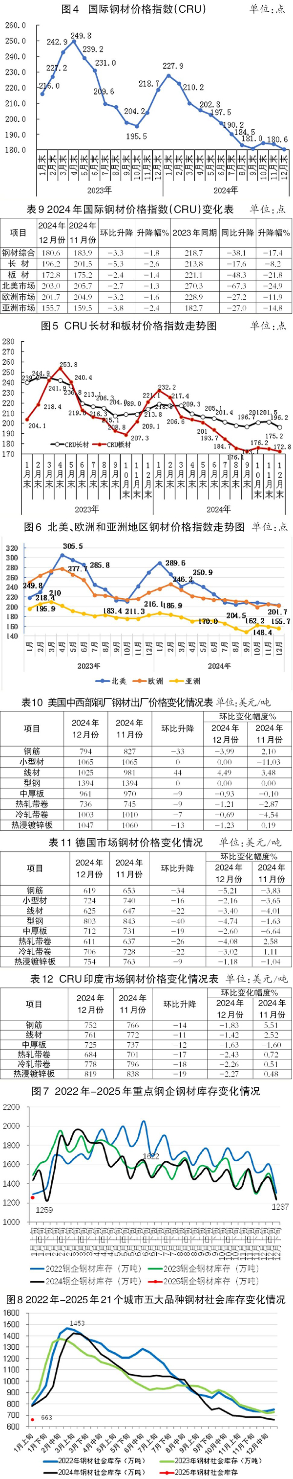 2024年12月份,CRU國際鋼材價格指數(shù)為180.6點,環(huán)比下降3.3點、降幅為1.8%,同比下降38.1點、降幅為17.4%,降幅繼續(xù)擴(kuò)大。
