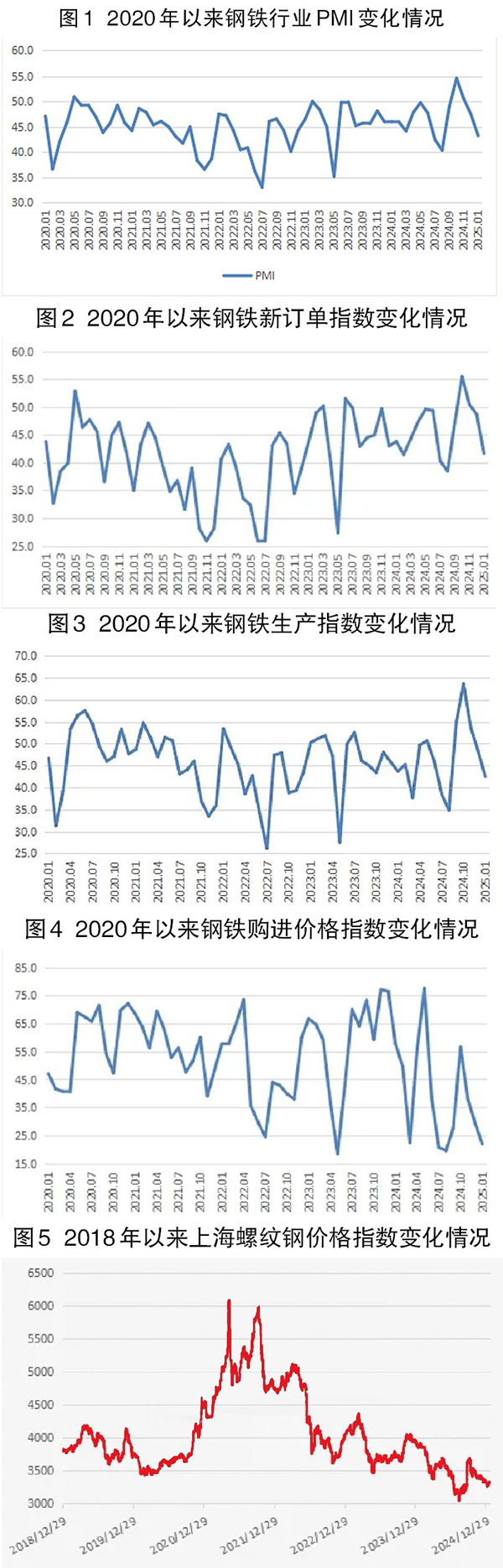 從中物聯(lián)鋼鐵物流專業(yè)委員會調(diào)查、發(fā)布的鋼鐵行業(yè)PMI(采購經(jīng)理指數(shù))來看,1月份為43.3%,環(huán)比下降4.2個百分點,顯示鋼鐵行業(yè)繼續(xù)偏弱運行。分項指數(shù)變化顯示,受季節(jié)性因素影響,鋼市需求進(jìn)一步收縮,鋼廠生產(chǎn)繼續(xù)放緩,原料價格保持下行,鋼材價格小幅震蕩下行。進(jìn)入2月份,鋼市需求繼續(xù)弱勢運行,生產(chǎn)端難有明顯回升,原材料和鋼材價格均在低位震蕩。