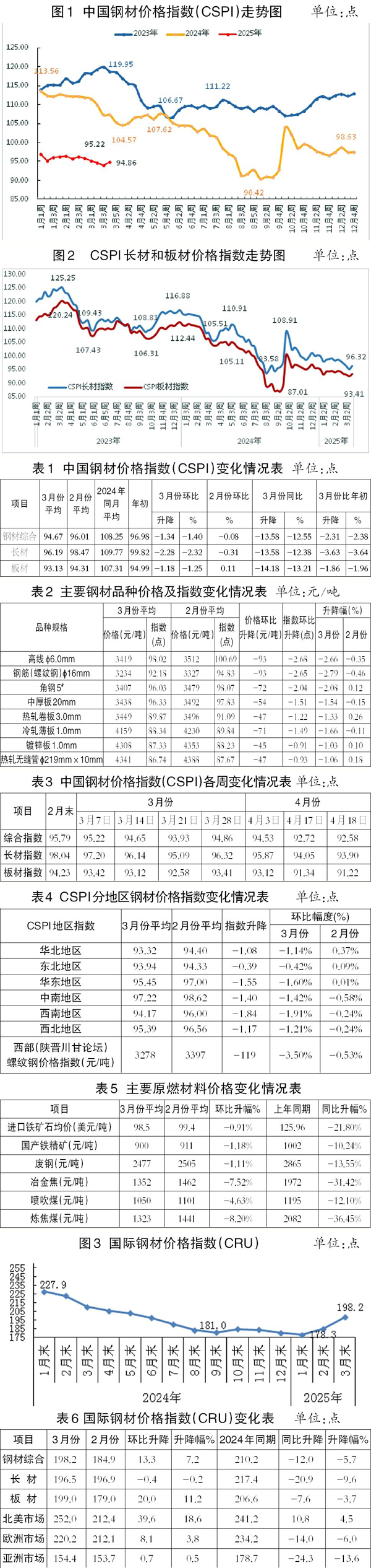 截至3月末,CSPI長(zhǎng)材指數(shù)為96.32點(diǎn),環(huán)比下降1.72點(diǎn)、降幅為1.75 %,CSPI板材指數(shù)為93.41點(diǎn),環(huán)比下降0.82點(diǎn)、降幅為0.87%。截至3月末,CSPI長(zhǎng)材、板材指數(shù)分別同比下降9.72點(diǎn)、11.10點(diǎn),降幅分別為9.17%、10.62 %。