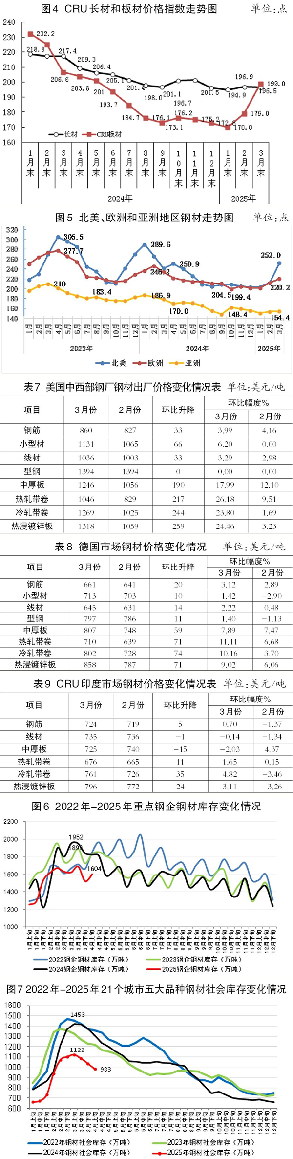 3月份,CRU長(zhǎng)材指數(shù)為196.5點(diǎn),環(huán)比下降0.4點(diǎn)、降幅為0.2 %;CRU板材指數(shù)為199.0點(diǎn),環(huán)比上升20.0點(diǎn)、升幅為11.2%。CRU長(zhǎng)材指數(shù)同比下降20.9點(diǎn)、降幅為9.6%;CRU板材指數(shù)同比下降7.6點(diǎn)、降幅為3.7%。