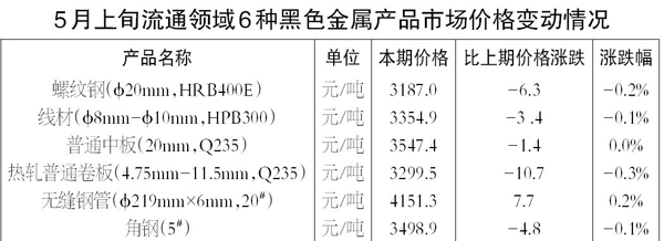 5月上旬,φ20毫米HRB400E螺紋鋼價(jià)格為3187.0元/噸,環(huán)比下降6.3元/噸,降幅為0.2%;φ8毫米~φ10毫米HPB300線材價(jià)格為3354.9元/噸,環(huán)比下降3.4元/噸,降幅為0.1%;20毫米Q235普通中板價(jià)格為3547.4元/噸,環(huán)比下降1.4;4.75毫米~11.5毫米Q235熱軋普通卷板價(jià)格為3299.5元/噸,環(huán)比下降10.7元/噸,降幅為0.3%;φ219毫米×6毫米20#無(wú)縫鋼管價(jià)格為4151.3元/噸,環(huán)比上升7.7元/噸,升幅為0.2%;5#角鋼價(jià)格為3498.9元/噸,環(huán)比下降4.8元/噸,降幅為0.1%。 (郭同炬)