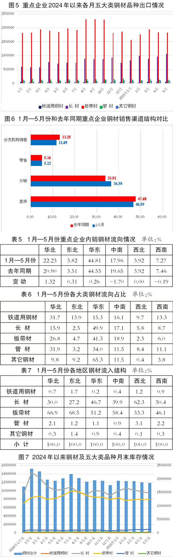 1月—5月份,重點企業(yè)內銷鋼材量為3072.7萬噸,內銷占比為95.4%,比2024年全年提升0.2個百分點,比去年同期下降0.3個百分點。相比去年同期,1月—5月份內銷鋼材料同比增加117.2萬噸、增長4.96%。