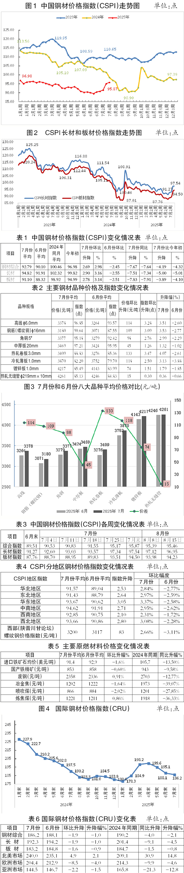 據(jù)中國(guó)鋼鐵工業(yè)協(xié)會(huì)監(jiān)測(cè),7月份,中國(guó)鋼材價(jià)格指數(shù)(CSPI)平均值為92.79點(diǎn),環(huán)比上升2.69點(diǎn),升幅為2.98%;同比下降7.67點(diǎn),降幅為7.64%。其中,CSPI長(zhǎng)材指數(shù)平均值為94.82點(diǎn),環(huán)比上升2.90點(diǎn)、升幅為3.16%,同比下降7.51點(diǎn)、降幅為7.34%;板材指數(shù)平均值為91.10點(diǎn),環(huán)比上升2.78點(diǎn)、升幅為3.14%,同比下降7.83點(diǎn)、降幅為7.91%。
