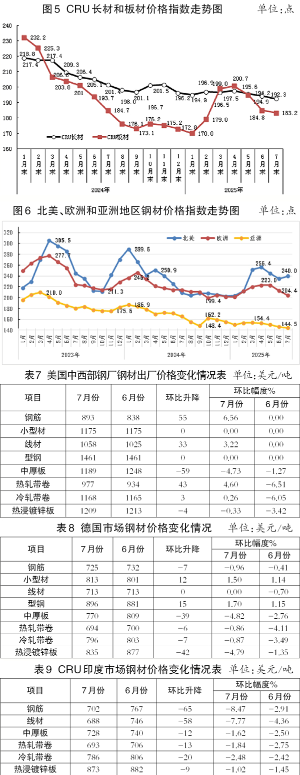 7月份,CRU國(guó)際鋼材價(jià)格指數(shù)為186.2點(diǎn),環(huán)比下降1.9點(diǎn)、降幅為1.0%,同比下降4.0點(diǎn)、降幅為2.1%。