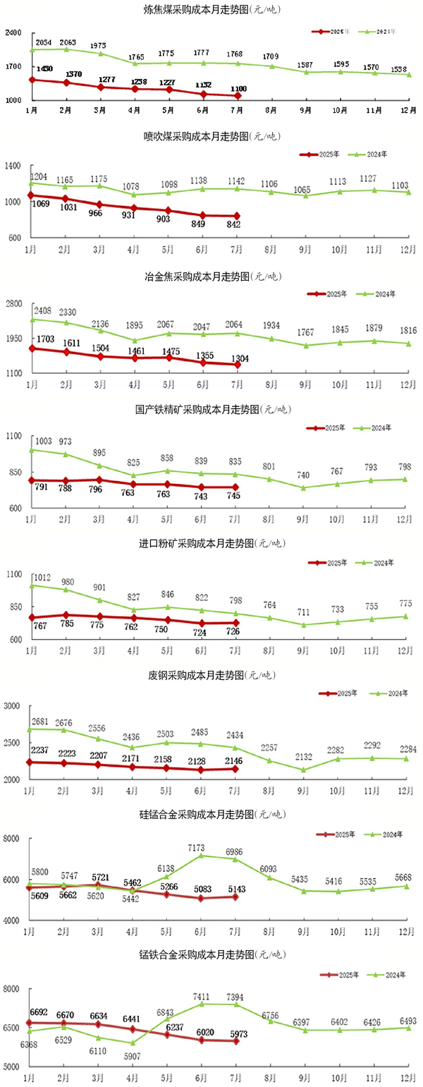7月份,冶金焦加權平均折算成干基的采購成本為1303.66元/噸,環比減少51.49元/噸,下降3.80%;1月—7月份累計平均折算成干基的采購成本為1482.27元/噸,同比減少646.01元/噸,下降30.35%。