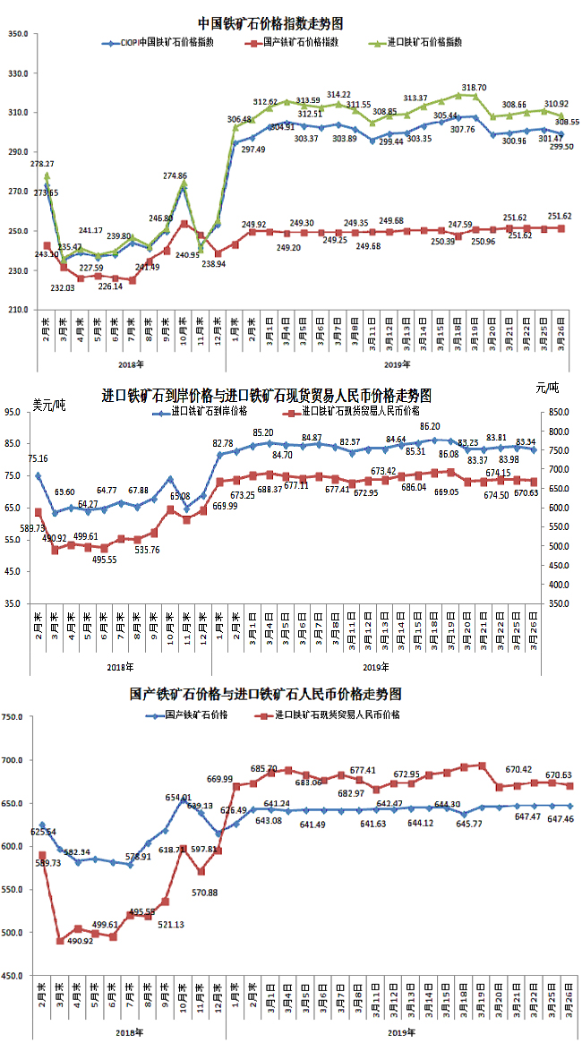 3月26日,中國(guó)鐵礦石價(jià)格指數(shù)(CIOPI)299.50點(diǎn),環(huán)比下降1.97點(diǎn),降幅為0.65%。其中:國(guó)產(chǎn)鐵礦石價(jià)格指數(shù)為251.62點(diǎn),環(huán)比上升0.15點(diǎn),升幅為0.06%;進(jìn)口鐵礦石價(jià)格指數(shù)為308.55點(diǎn),環(huán)比下降2.37點(diǎn),降幅為0.76%。
