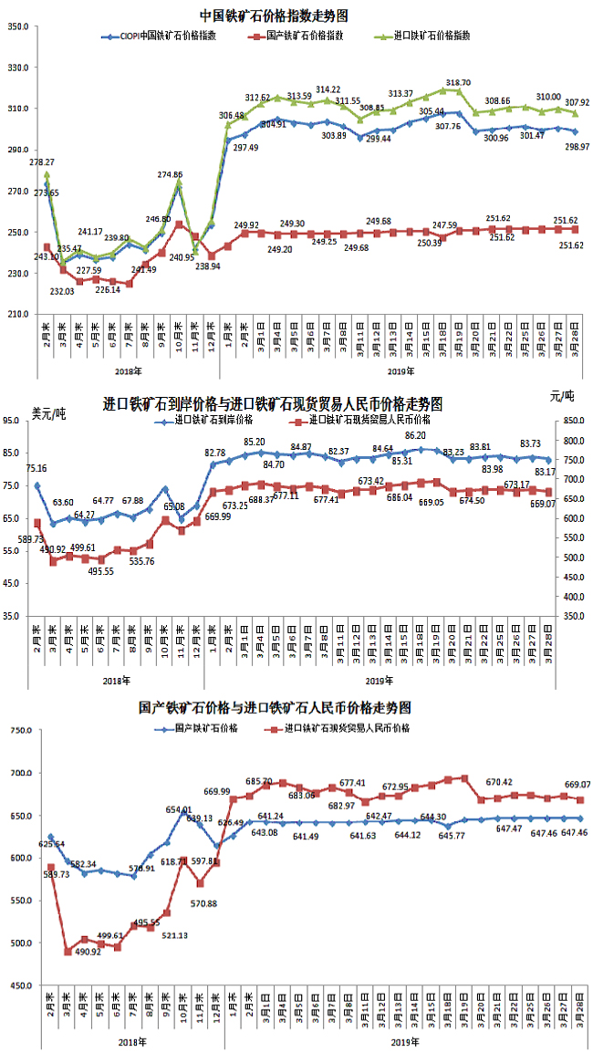 3月28日,中國鐵礦石價(jià)格指數(shù)(CIOPI)298.97點(diǎn),環(huán)比下降1.74點(diǎn),降幅為0.58%。其中:國產(chǎn)鐵礦石價(jià)格指數(shù)為251.62點(diǎn),環(huán)比持平;進(jìn)口鐵礦石價(jià)格指數(shù)為307.92點(diǎn),環(huán)比下降2.07點(diǎn),降幅為0.67%。