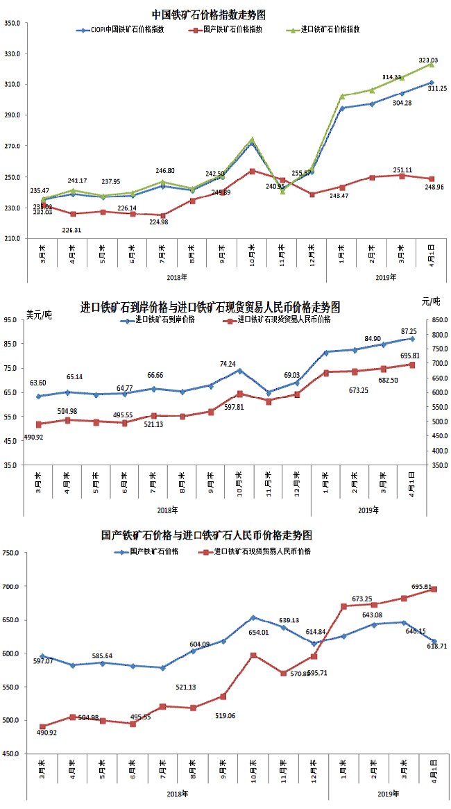 4月1日,中國鐵礦石價格指數(CIOPI)311.25點,環比上升6.98點,升幅為2.29%。其中:國產鐵礦石價格指數為248.96點,環比下降2.15點,降幅為0.86%;進口鐵礦石價格指數為323.03點,環比上升8.70點,升幅為2.77%。