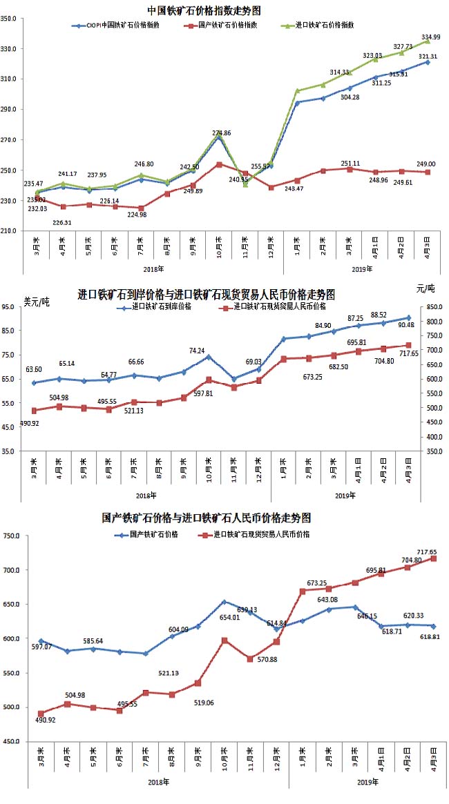 4月3日,中國鐵礦石價格指數(CIOPI)321.31點,環比上升6.01點,升幅為1.90%。其中:國產鐵礦石價格指數為249.00點,環比下降0.61點,降幅為0.25%;進口鐵礦石價格指數為334.99點,環比上升7.26點,升幅為2.21%。