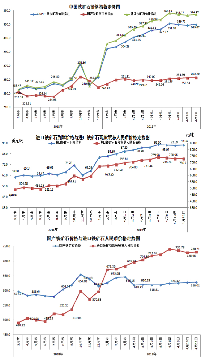 4月11日,中國鐵礦石價格指數(shù)(CIOPI)329.87點,環(huán)比上升1.43點,升幅為0.43%。其中:國產(chǎn)鐵礦石價格指數(shù)為252.70點,環(huán)比上升0.17點,升幅為0.07%;進口鐵礦石價格指數(shù)為344.47點,環(huán)比上升1.67點,升幅為0.49%。
