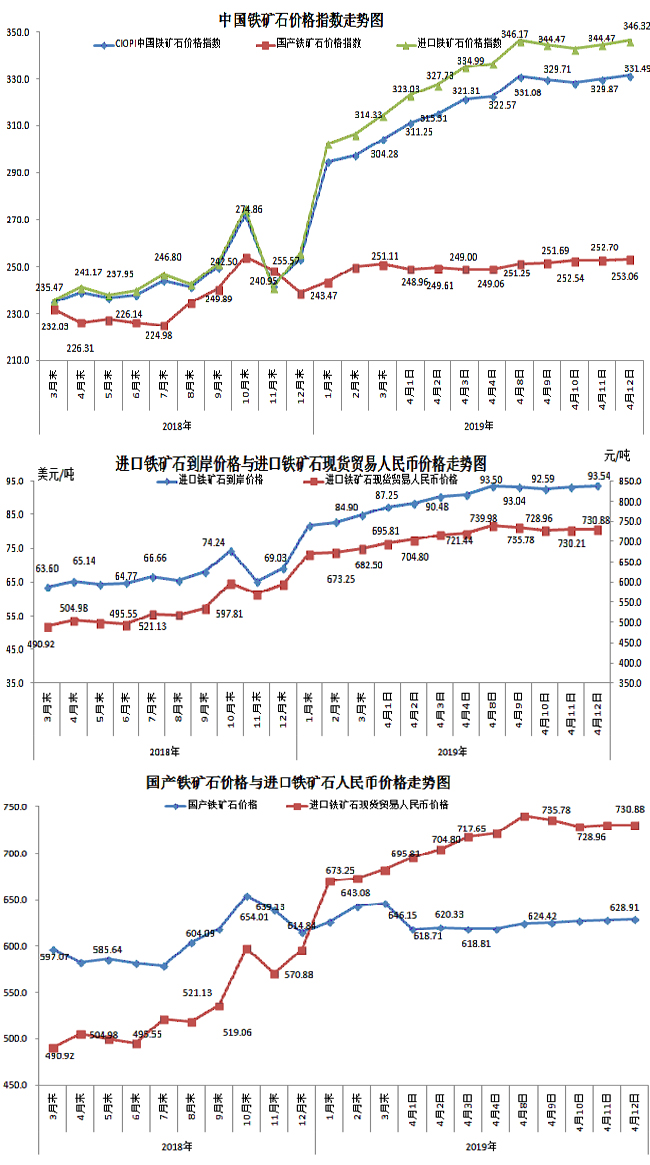 4月12日,國(guó)產(chǎn)鐵礦石62%品位干基鐵精礦含稅價(jià)格為628.91元/噸,環(huán)比每噸上升0.89元,升幅為0.14%;比進(jìn)口鐵礦石低101.97元/噸,降幅為13.95%;當(dāng)月平均價(jià)格為623.47元/噸,比進(jìn)口鐵礦石低99.36元/噸,降幅為13.75%。