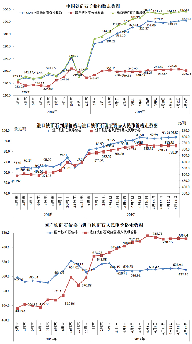 4月15日,中國(guó)鐵礦石價(jià)格指數(shù)(CIOPI)332.01點(diǎn),環(huán)比上升0.52點(diǎn),升幅為0.16%。其中:國(guó)產(chǎn)鐵礦石價(jià)格指數(shù)為250.84點(diǎn),環(huán)比下降2.22點(diǎn),降幅為0.88%;進(jìn)口鐵礦石價(jià)格指數(shù)為347.35點(diǎn),環(huán)比上升1.04點(diǎn),升幅為0.30%。