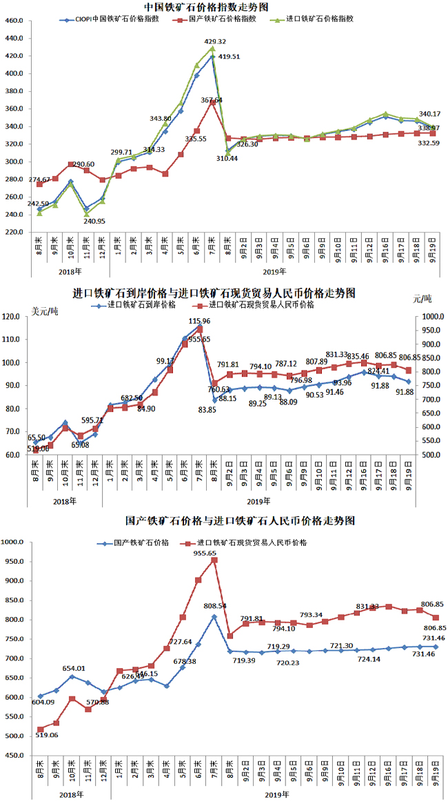 9月19日,中國鐵礦石價格指數(shù)(CIOPI)338.97點,環(huán)比下降7.10點,降幅為2.05%。其中:國產(chǎn)鐵礦石價格指數(shù)為332.59點,環(huán)比持平;進(jìn)口鐵礦石價格指數(shù)為340.17點,環(huán)比下降8.44點,降幅為2.42%。