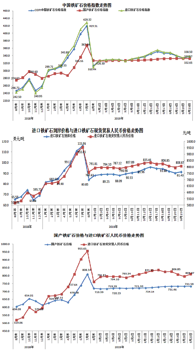 9月23日,現(xiàn)貨貿(mào)易進(jìn)口鐵礦石62%品位干基粉礦人民幣含稅價(jià)格為808.87元/噸,環(huán)比每噸上升13.99元,升幅為1.76%,當(dāng)月平均價(jià)格為807.59元/噸。