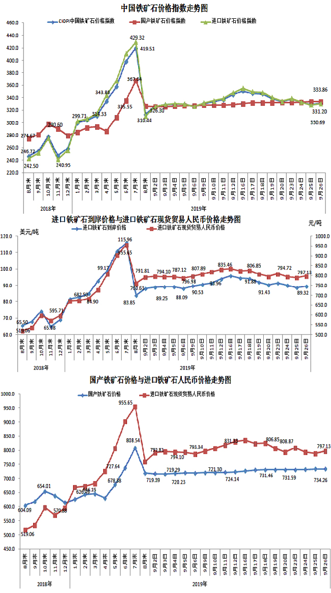 9月26日,中國鐵礦石價(jià)格指數(shù)(CIOPI)331.20點(diǎn),環(huán)比上升2.04點(diǎn),升幅為0.62%。其中:國產(chǎn)鐵礦石價(jià)格指數(shù)為333.86點(diǎn),環(huán)比上升0.09點(diǎn),升幅為0.03%;進(jìn)口鐵礦石價(jià)格指數(shù)為330.69點(diǎn),環(huán)比上升2.41點(diǎn),降幅為0.73%。