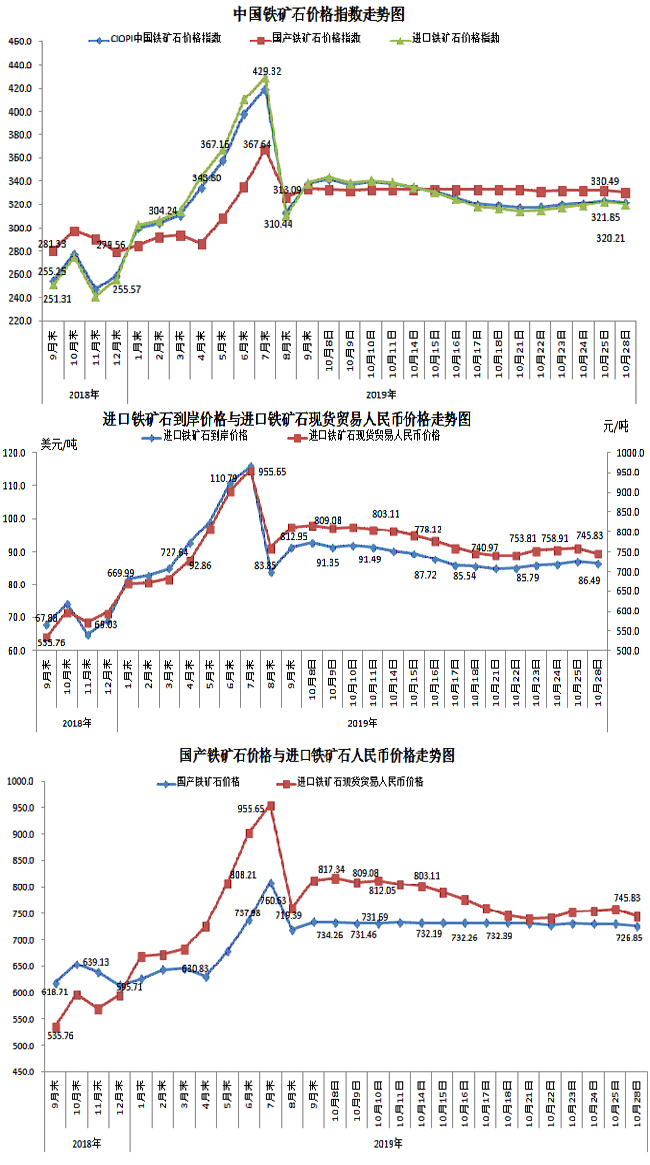 10月28日,中國鐵礦石價格指數(CIOPI)321.85點,環比下降1.97點,降幅為0.61%。其中:國產鐵礦石價格指數為330.49點,環比下降1.79點,降幅為0.54%;進口鐵礦石價格指數為320.21點,環比下降2.00點,降幅為0.62%。