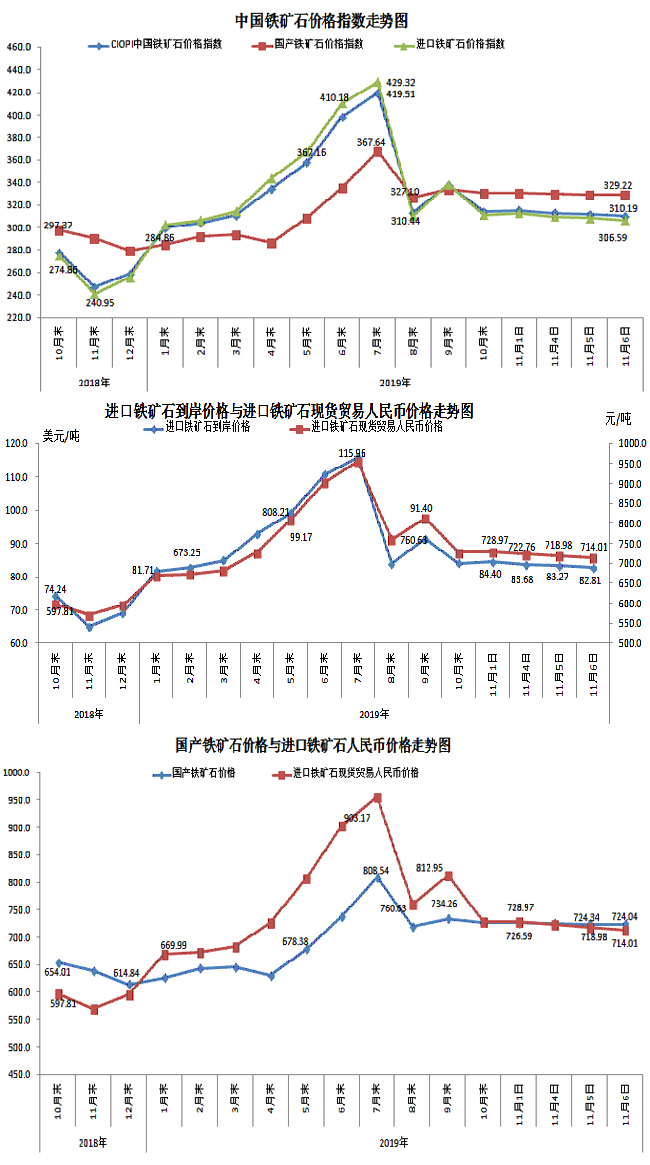11月6日,中國鐵礦石價格指數(CIOPI)310.19點,環比下降1.45點,降幅為0.47%。其中:國產鐵礦石價格指數為329.22點,環比下降0.13點,降幅為0.04%;進口鐵礦石價格指數為306.59點,環比下降1.70點,降幅為0.55%。