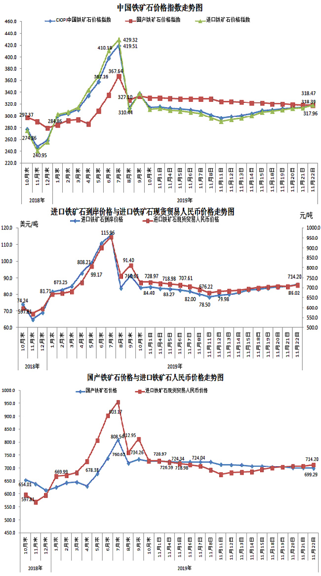 11月22日,現貨貿易進口鐵礦石62%品位干基粉礦人民幣含稅價格為714.20元/噸,環比每噸上升6.39元,升幅為0.90%,當月平均價格為703.00元/噸。
