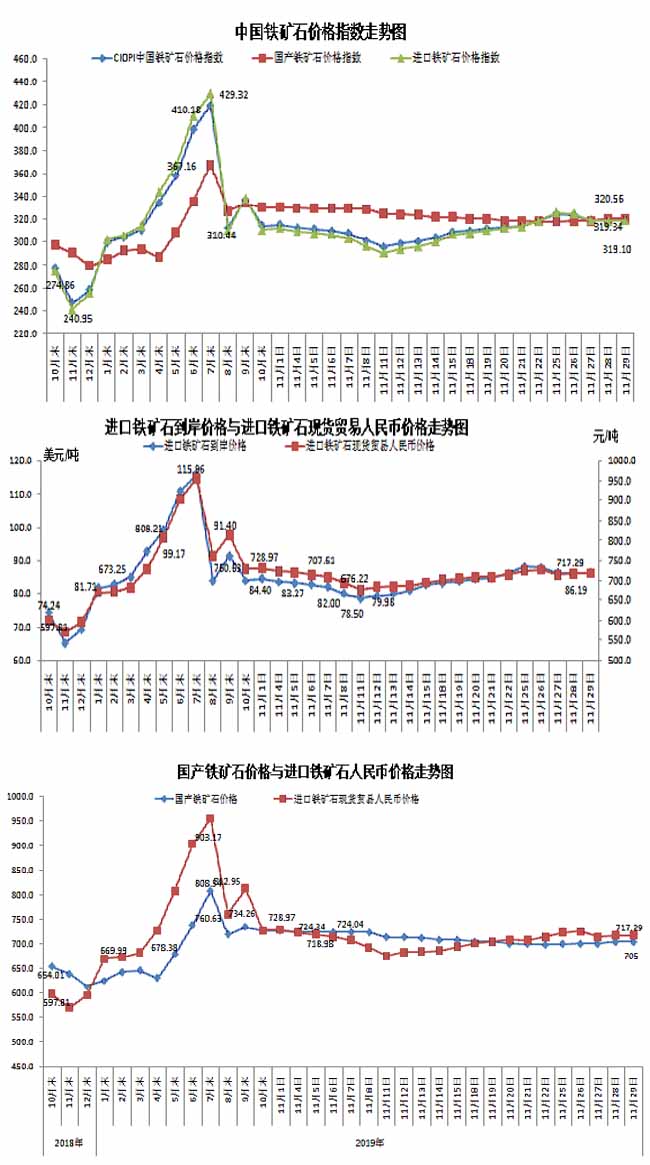 11月29日,中國(guó)鐵礦石價(jià)格指數(shù)(CIOPI)319.34點(diǎn),環(huán)比上升0.48點(diǎn),升幅為0.15%。其中:國(guó)產(chǎn)鐵礦石價(jià)格指數(shù)為320.56點(diǎn),環(huán)比上升0.10點(diǎn),升幅為0.03%;進(jìn)口鐵礦石價(jià)格指數(shù)為319.10點(diǎn),環(huán)比上升0.56點(diǎn),升幅為0.17%。