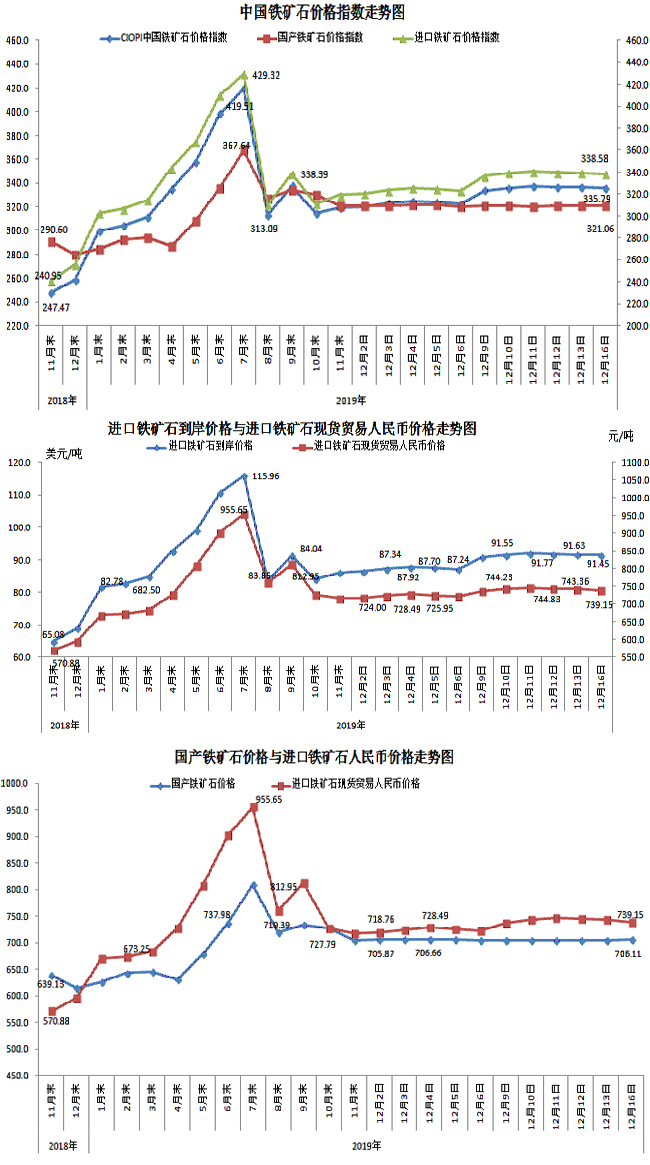 12月16日,中國鐵礦石價格指數(CIOPI)335.79點,環比下降0.49點,降幅為0.14%。其中:國產鐵礦石價格指數為321.06點,環比上升0.46點,升幅為0.14%;進口鐵礦石價格指數為338.58點,環比下降0.67點,降幅為0.20%。