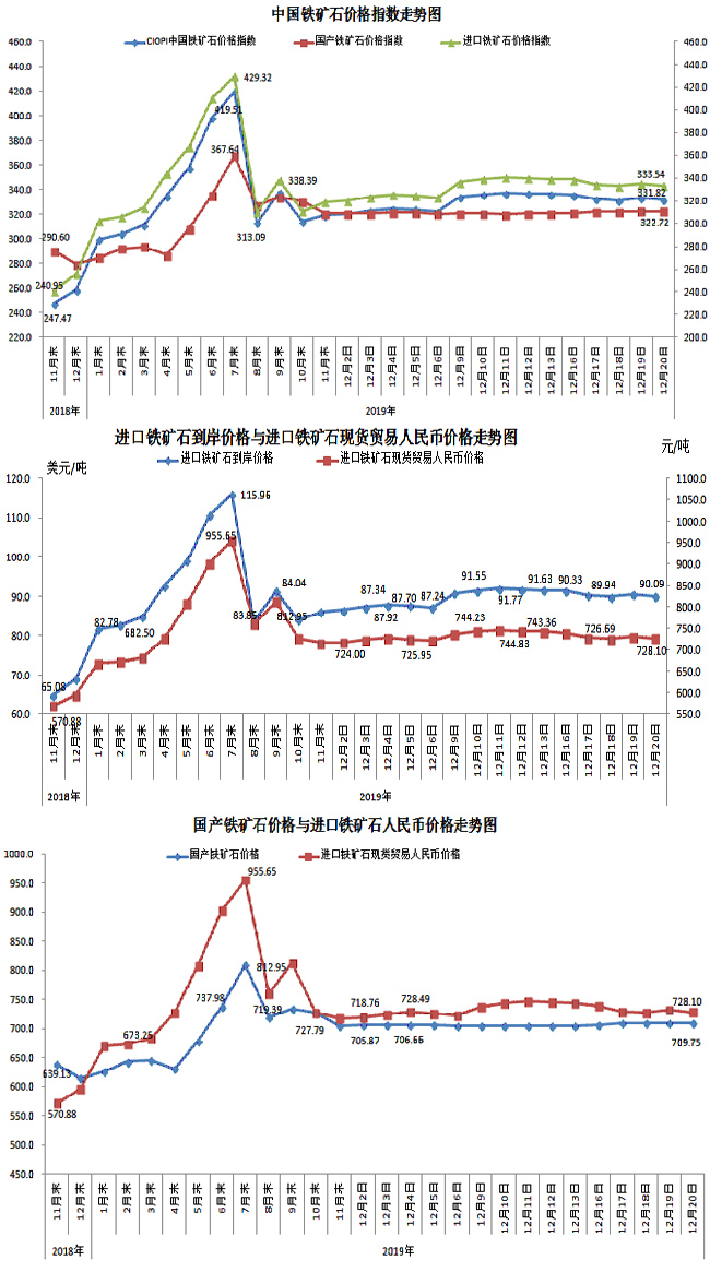 12月20日,中國鐵礦石價格指數(shù)(CIOPI)331.82點,環(huán)比下降1.43點,降幅為0.43%。其中:國產鐵礦石價格指數(shù)為322.72點,環(huán)比持平;進口鐵礦石價格指數(shù)為333.54點,環(huán)比下降1.70點,降幅為0.51%。