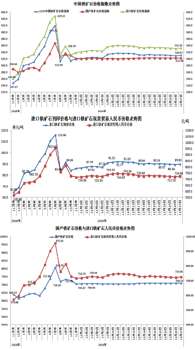 12月27日,中國鐵礦石價格指數(CIOPI)330.97點,環比上升1.40點,升幅為0.43%。其中:國產鐵礦石價格指數為322.48點,環比持平;進口鐵礦石價格指數為332.58點,環比上升1.67點,升幅為0.50%。