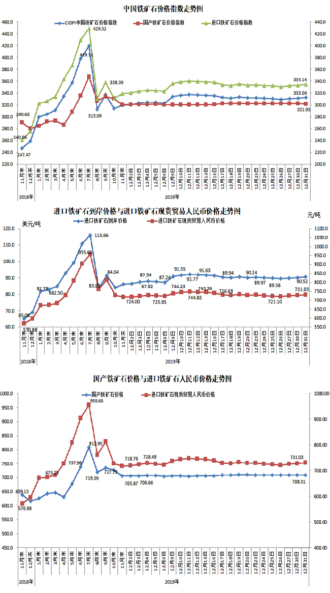12月31日,中國鐵礦石價格指數(CIOPI)333.04點,環比上升1.55點,升幅為0.47%。其中:國產鐵礦石價格指數為321.93點,環比下降0.27點,降幅為0.08%;進口鐵礦石價格指數為335.14點,環比上升1.89點,升幅為0.57%。