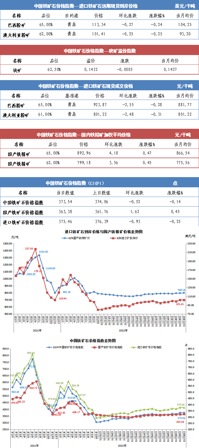 【行業指數】11月30日中國鐵礦石價格指數