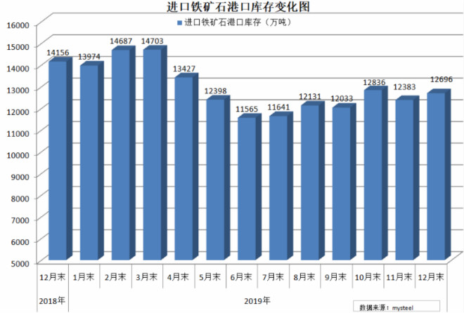 2、鐵礦石冬儲預期上升,進口礦港存由降轉增2019年12月末,全國進口鐵礦石港口庫存量為1.27億噸,環比上升313萬噸,升幅為2.53%。11月份,全國鐵礦石進口量9065萬噸,同比增長5.05%,從企業庫存來看,也有冬儲的需要。總體來看,鐵礦石市場供需形勢較為寬松。(見下圖)