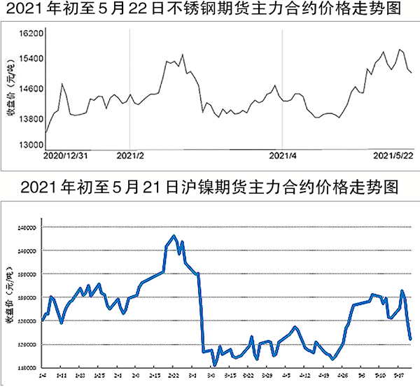 5月份,滬鎳期貨主力合約的最高價格出現(xiàn)在5月10日,為135570元/噸;到5月21日,其最低價格降至124160元/噸;當(dāng)月最大價差已經(jīng)達(dá)到11410元/噸。僅在5月18日(上周二)到5月21日(上周五)的4個交易日期間,滬鎳主力合約的收盤價、最高價和最低價就分別下降了10230元/噸、6590元/噸和6170元/噸,降幅分別達(dá)7.61%、4.89%和4.73%。