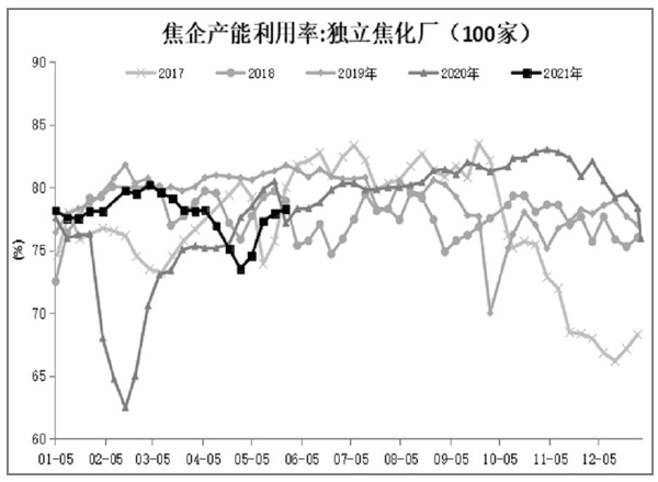 從供應端來看,5月9日,中央生態(tài)環(huán)境保護督察組在山西、遼寧等8省為期一個月的環(huán)保督察基本結(jié)束,限產(chǎn)政策力度逐漸轉(zhuǎn)向?qū)捤桑藭r焦企盈利普遍較高,刺激企業(yè)提產(chǎn)情緒快速釋放,焦炭供應明顯回升,樣本焦企產(chǎn)能利用率由73.5%反彈至78%左右。5月27日,生態(tài)環(huán)境部相關負責人表示,目前已派出11個專業(yè)組,對鋼鐵、焦化等重點行業(yè)開展專項監(jiān)督,加大對環(huán)境違法行為的打擊力度,并極力反對動輒停產(chǎn)關閉、先停后治等簡單粗暴的“一刀切”行為,這意味著環(huán)保政策可能不會再進一步放松。另外,時間臨近建黨百年紀念日,屆時環(huán)保、安全等政策必然會趨嚴。當前,噸焦盈利仍處高位,焦企生產(chǎn)積極性良好,6月份焦炭供應有望保持穩(wěn)中有升態(tài)勢,但在政策的約束下,增長的空間或相對有限。