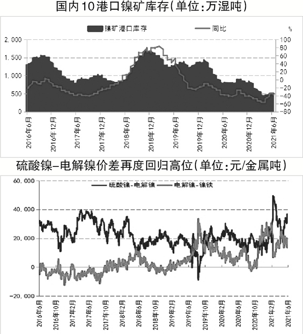新能源產業鏈動能強勁。今年以來,為對沖新冠肺炎疫情對經濟的影響,拜登政府連番推出財政刺激計劃,其中對新能源行業扶持意圖明確。全球各大車企銷量公布的數據顯示,新能源汽車在全球范圍內銷量暴增,而鎳作為動力電池的核心材料之一,市場對其未來發展的信心再獲提振。從現貨端來看,電池級硫酸鎳較電解鎳價差再創高位。3月份因電解鎳價格劇烈回調,電池級硫酸鎳較一級鎳(豆)溢價創近3年來新高,達4.6萬元/金屬噸。在經歷4月份的回落以后,因終端需求強勁,電池企業大幅擴張年度排產計劃,導致硫酸鎳需求持續上漲,6月份硫酸鎳-電解鎳價差再度回歸至3萬元/噸以上,處于歷史相對高位。據測算,當兩者價差超過1.5萬元/噸的時候,三元前驅體企業采購鎳豆制備硫酸鎳就有利可圖,在此背景下,采購電解鎳制備硫酸鎳利潤豐厚,帶動上游鎳鹽、鎳豆迅速去庫存。