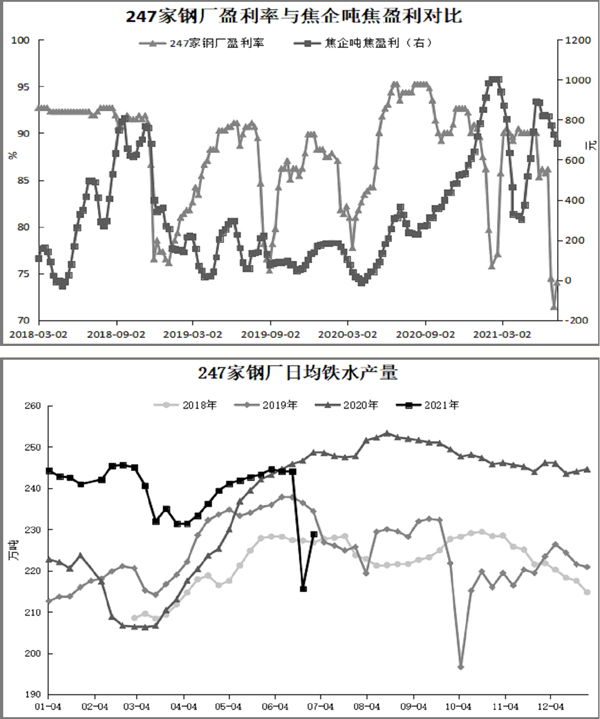 需求方面,近期粗鋼減量預(yù)期持續(xù)“發(fā)酵”,對原材料市場擾動增加。據(jù)相關(guān)機構(gòu)調(diào)研,目前,部分省份及部分國有鋼鐵企業(yè)已陸續(xù)推出壓減粗鋼產(chǎn)量的計劃,同時個別鋼廠將同步壓減生鐵產(chǎn)量,壓減措施包括暫停個別高爐運行、降低生產(chǎn)負荷、對高爐進行為期3~5個月的檢修等等,另有部分鋼廠已開始減產(chǎn),但還沒有明確減產(chǎn)時間與減產(chǎn)量,具體政策仍有待持續(xù)跟蹤。上周數(shù)據(jù)顯示,247家鋼廠高爐日均鐵水產(chǎn)量為228.9萬噸,環(huán)比回升13.27萬噸,同比下降19.77萬噸。若下半年粗鋼減量政策嚴(yán)格執(zhí)行,焦炭需求將較上半年或去年下半年有較大幅度的回落,需持續(xù)關(guān)注鋼廠限產(chǎn)政策變化。