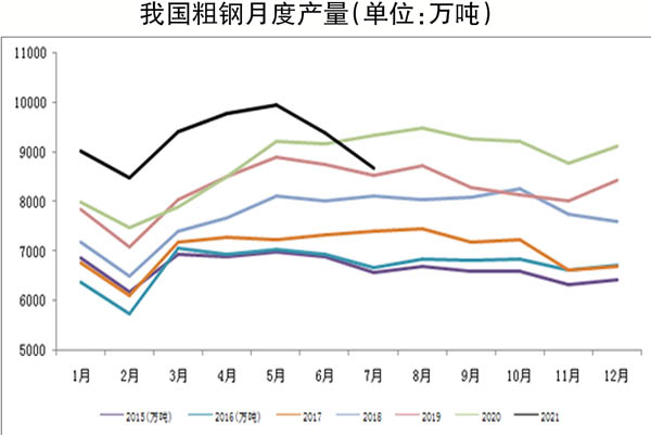 雖然前期市場心態被“穩價保供政策”擾動,擔心壓減產量政策的執行力度和效果,但是兩個政策的實行和目標達成其實并不沖突,高層對于壓減產量的態度也從未松懈,全年實現粗鋼產量同比不增長的確定性很高。中國鋼鐵工業協會在近期召開的黨委常委(擴大)會議上再次強調,要堅決執行“去產能回頭看和壓減粗鋼產量”有關工作要求。中國寶武集團董事長陳德榮也提出:“堅決執行限產政策,這是政治問題,沒有討價還價的余地,必須堅決貫徹落實”。另外,繼山東、江蘇、山西等省份出臺壓減產量的具體措施或者整體框架后,近期河北省唐山市也出臺《唐山市2022年北京冬奧會和冬殘奧會空氣質量保障實施方案》(征求意見稿),2021年河北省唐山市將壓減粗鋼產量1237萬噸。另外,國家統計局公布的數據顯示,2021年7月份,我國粗鋼產量為8679萬噸,同比下降8.4%,較6月份的粗鋼產量9387.5萬噸繼續回落708萬噸,已連續第2個月環比回落,且回落幅度由5.61%擴大至7.54%;全國粗鋼日均產量為279.9萬噸,環比下降10.5%。1月~7月份,我國粗鋼產量為64933萬噸,同比增長8.0%,較上半年的11.8%同比增幅回落3.8個百分點。