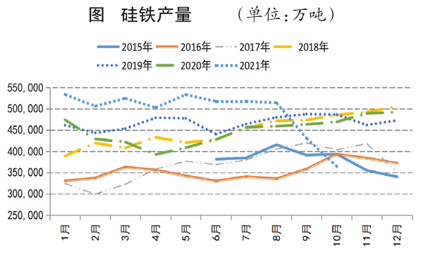 2022年,市場層面的影響或導致鐵合金需求出現明顯下降。2021年鋼材產量呈前高后低走勢,1月~6月份大幅增產,7月~10月份出現明顯減產走勢。年末粗鋼產量的下降主因是政策限產,但限產的同時,由于房地產市場萎縮,粗鋼需求同樣大幅下降,導致限產并未使得粗鋼出現供需缺口,鋼價反而回落。預計房地產在“房住不炒”的前提下,很難再現過去20年的輝煌,房地產商面臨資金窘境,新建房屋的減少會持續降低粗鋼的需求。預計鋼材需求在2022年明顯萎縮,加之粗鋼限產持續,將導致粗鋼明顯減產,進而導致鐵合金需求下降5%~10%。