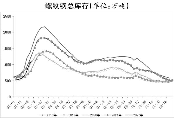 今年2月份正值北京冬奧會(huì)期間,供應(yīng)端偏緊利多鋼材價(jià)格;2021年底至今,市場對(duì)下游“小陽春”抱有樂觀預(yù)期,推動(dòng)鋼材價(jià)格整理中偏強(qiáng)運(yùn)行,而真實(shí)需求有望在3月份證偽。根據(jù)歷史數(shù)據(jù)統(tǒng)計(jì),螺紋鋼庫存高點(diǎn)或出現(xiàn)在2月下旬,今年的庫存水平較低,以累庫數(shù)據(jù)推算,全年庫存峰值或不足1400萬噸,將大幅低于過去兩年,對(duì)螺紋鋼價(jià)格構(gòu)成支撐。綜合來看,鋼材市場偏暖運(yùn)行,監(jiān)管層針對(duì)大宗商品惡意炒作的管理依舊嚴(yán)格,或抑制黑色系鋼材價(jià)格上升空間。